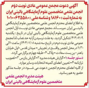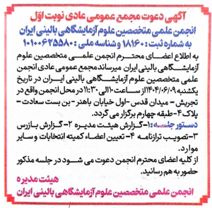 اولین آگهی کمیته نظارت بر انتخابات انجمن علمی متخصصین علوم آزمایشگاهی بالینی ایران